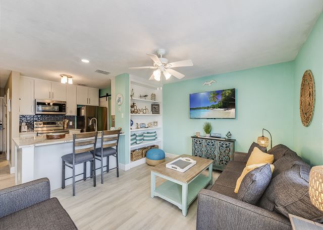 Reel Teal Retreat is a charming waterfront condo perfect for relaxing coastal getaways. With a private patio overlooking the canal, a fully equipped kitchen, and a comfortable open living area, it's ideal for couples, small families, or friends. Enjoy community amenities like a pool, hot tub, and BBQ area just steps from the water.