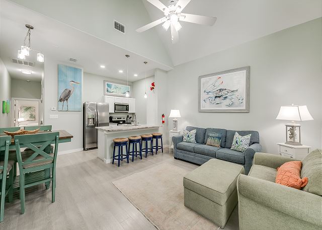 The kitchen offers everything needed for home-cooked meals or quick snacks between beach adventures. Enjoy stainless steel appliances, granite counters, and both Keurig and drip coffee makers. The dining table comfortably seats four, with additional seating at the bar for casual bites.
