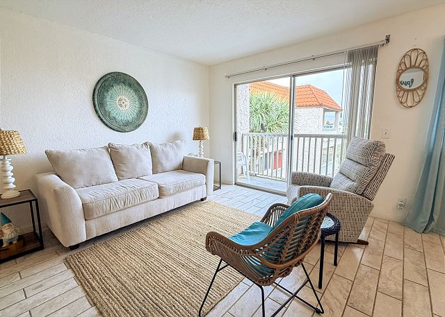 Sunny Daze offers a peaceful waterfront escape with a private balcony overlooking the lagoon-style pool. Perfect for boaters and those seeking tranquility, it combines modern comforts with easy access to local restaurants, surf shops, and attractions.