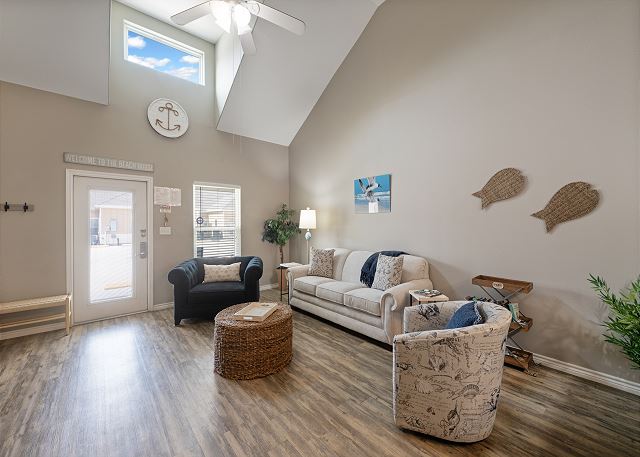 Guests love the inviting, first-floor coastal retreat that combines modern coastal décor with thoughtful amenities. The private patio overlooks the sparkling pool, while the open living and dining area provides space to relax or entertain. Pet-friendly accommodations and a short walk to the beach make this home ideal for families, friends, or couples. Come stay with Padre Escapes!