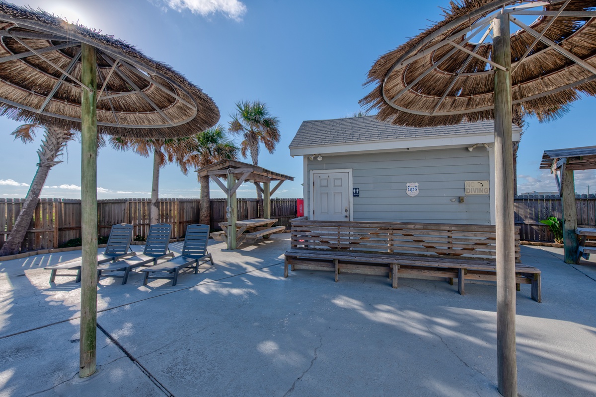 - Poolside loungers, chairs, and Tiki huts